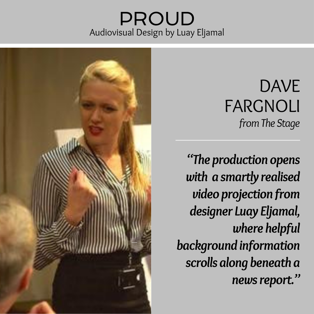 Proud takes place in an alternate reality, shortly after the 2011 Canadian Federal election. It deviated from reality in that instead of the NDP winning 59 seats in Quebec, those seats have now gone to the conservatives. This animation served to communicate this through a projection that played at the start of the production.